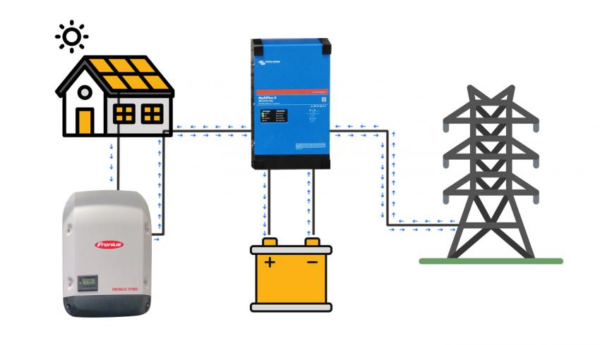 To połączenie systemu on-grid i off-grid. Instalacja działa podłączona do sieci, ale ma również magazyny energii (baterie), które gromadzą nadmiar prądu na późniejsze wykorzystanie. Daje to większą niezależność, bo masz prąd nawet wtedy, gdy nie ma dostaw z sieci (np. podczas awarii).