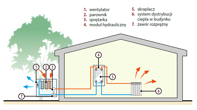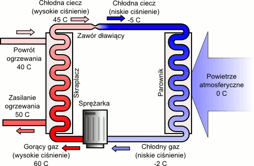 - Ogrzewa to ciepło za pomocą sprężarki.