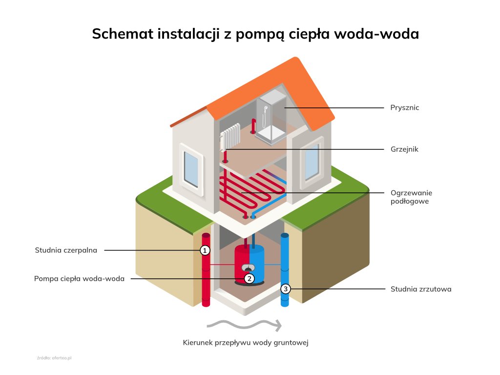 Woda dostarcza energię cieplną do pompy ciepła, która następnie, poprzez sprężarkę, przekształca tę energię i przekazuje ciepło do budynku. Po wykorzystaniu, wychłodzona woda jest zrzucana do drugiej studni głębinowej, co minimalizuje wpływ na środowisko.