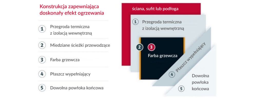 Farba grzewcza pozwala na stworzenie całkowicie niewidocznego ogrzewania, ponieważ działa bez grzejników, kabli ani innych widocznych elementów. Ogrzewanie jest ukryte w ścianach, suficie lub podłodze.